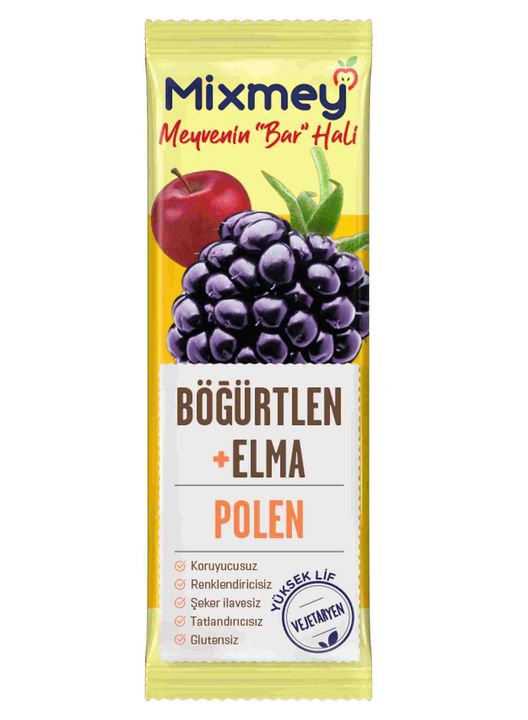 Ilave seker, tatlandirici, renklendirici, koruyucu ve glüten içermeyen “Elmali, Bögürtlenli ve Polenli Meyve Bar” lezzetimiz vejetaryen olup, ayni zamanda yüksek lif degerine sahiptir.