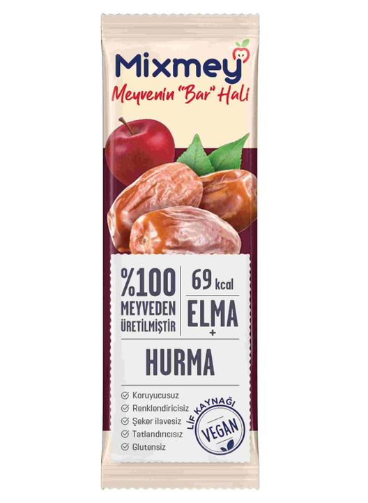 Ilave seker, tatlandirici, renklendirici, koruyucu ve glüten içermeyen “Elmali ve Hurmali Meyve Bar” lezzetimiz vegan olup, ayni zamanda zengin bir lif kaynagidir.